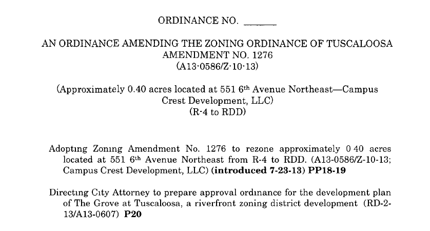 There may be some over-riding concerns about parking but on Tuesday the City Council may approve the re-zoning that will be necessary to allow Campus Crest Developments to build a student housing project at the site of the old Waterworks. The Tuscaloosa News has yet to cover one aspect of the story though, even though one of its reporters was given a stack of papers that was presented to the members of the Planning and Zoning Commission by someone during the public comments. There was page after page detailing the unsavory past of Campus Crest CEO Ted Rollins.