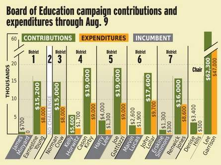 According to campaign finance reports filed by the candidates as of Aug. 9, more than $181,000 has been contributed to the campaigns of the 13 candidates in the 2013 race, which is more than the total funds raised in the three previous school board elections combined.