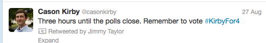 Of course Jimmy Taylor as an operative of The Machine was busily retweeting in the waning hours of the municipal election day to get out the vote for his fellow Machine candidate Cason Kirby.