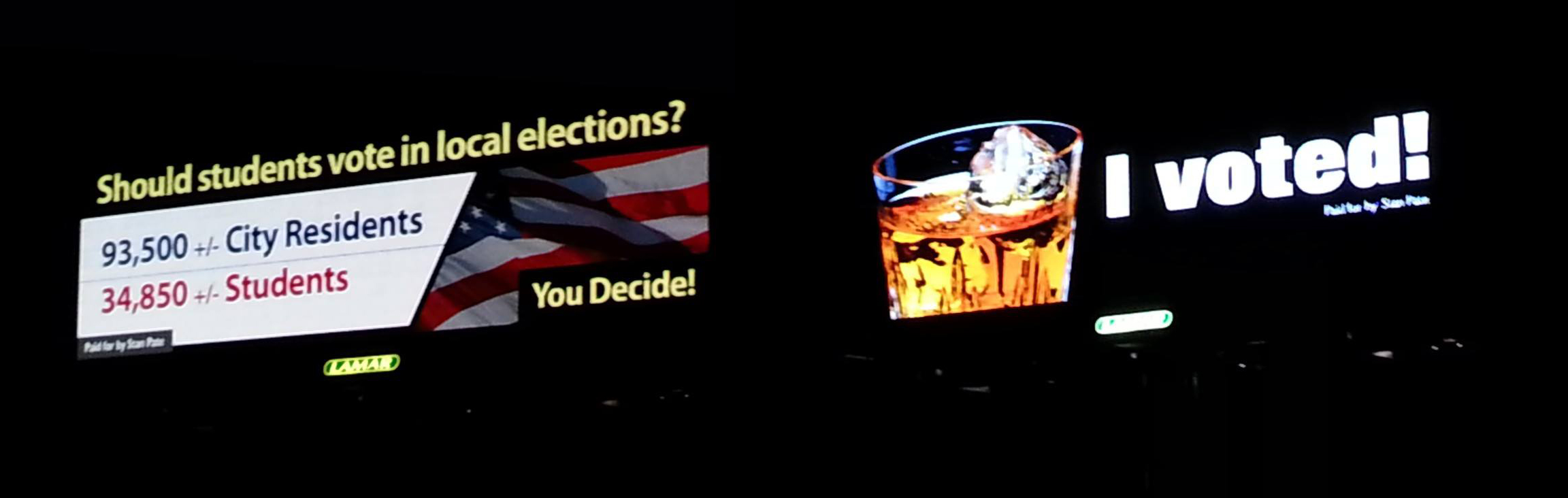 In the last municipal election votes by members of The Machine at the University may have decided who was elected to chair the School Board and who represented District 4 on the school board. Reports of inducements for students to vote involving free alcohol and rides in limousines to the polls were found in state and national newspapers. There were even billboards critical of the student vote.