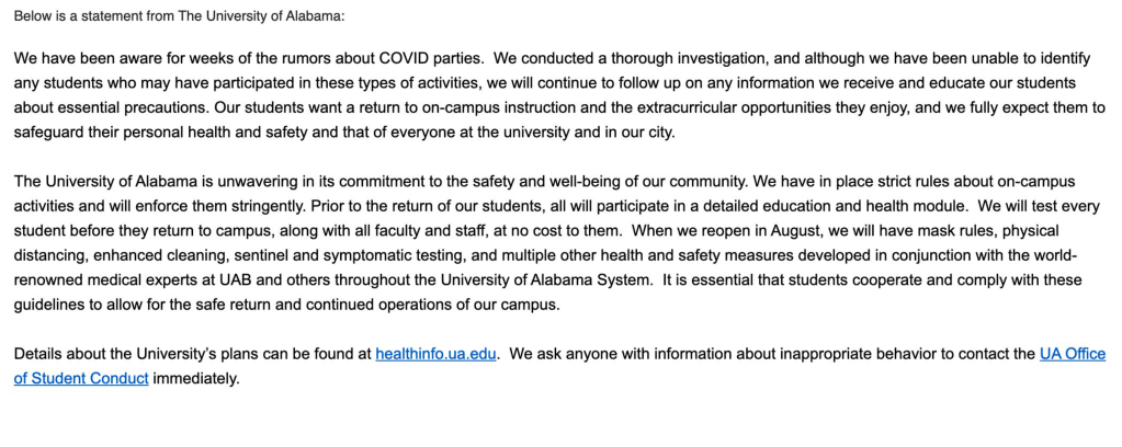 However, if any of the videos had ever been posted on social media sites they seem to have been scrubbed. Conceivably the subjects in the alleged COVID party videos may have decided that perhaps they shouldn’t be feeling all that proud about them. If University of Alabama students had been in the videos, then the University’s “thorough investigation” was certainly impeded.