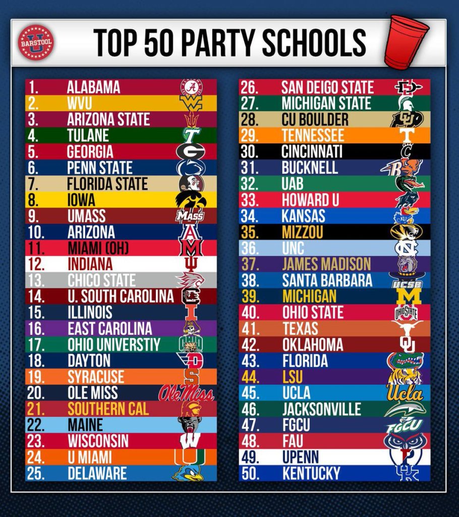 A March 2022 post by MeTVfm celebrated the classification on the Barstool Sports list of the University as the Nation’s #1 Party School: