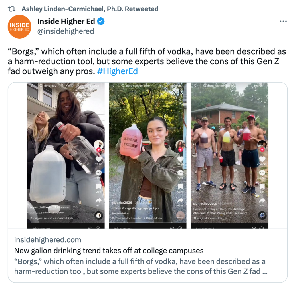 Alonzo wrote that Penn State‘s Ashley Linden-Carmichael warned against the beverage. She retweeted Inside Higher Ed‘s post: